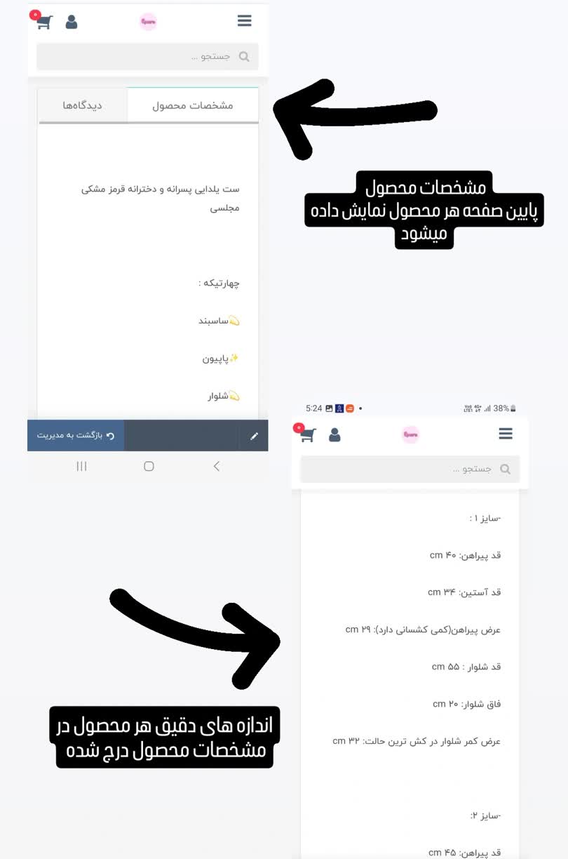 در قسمت مشخصات هر محصول اندازه های دقیق اون محصول ثبت شده .👇🏻
