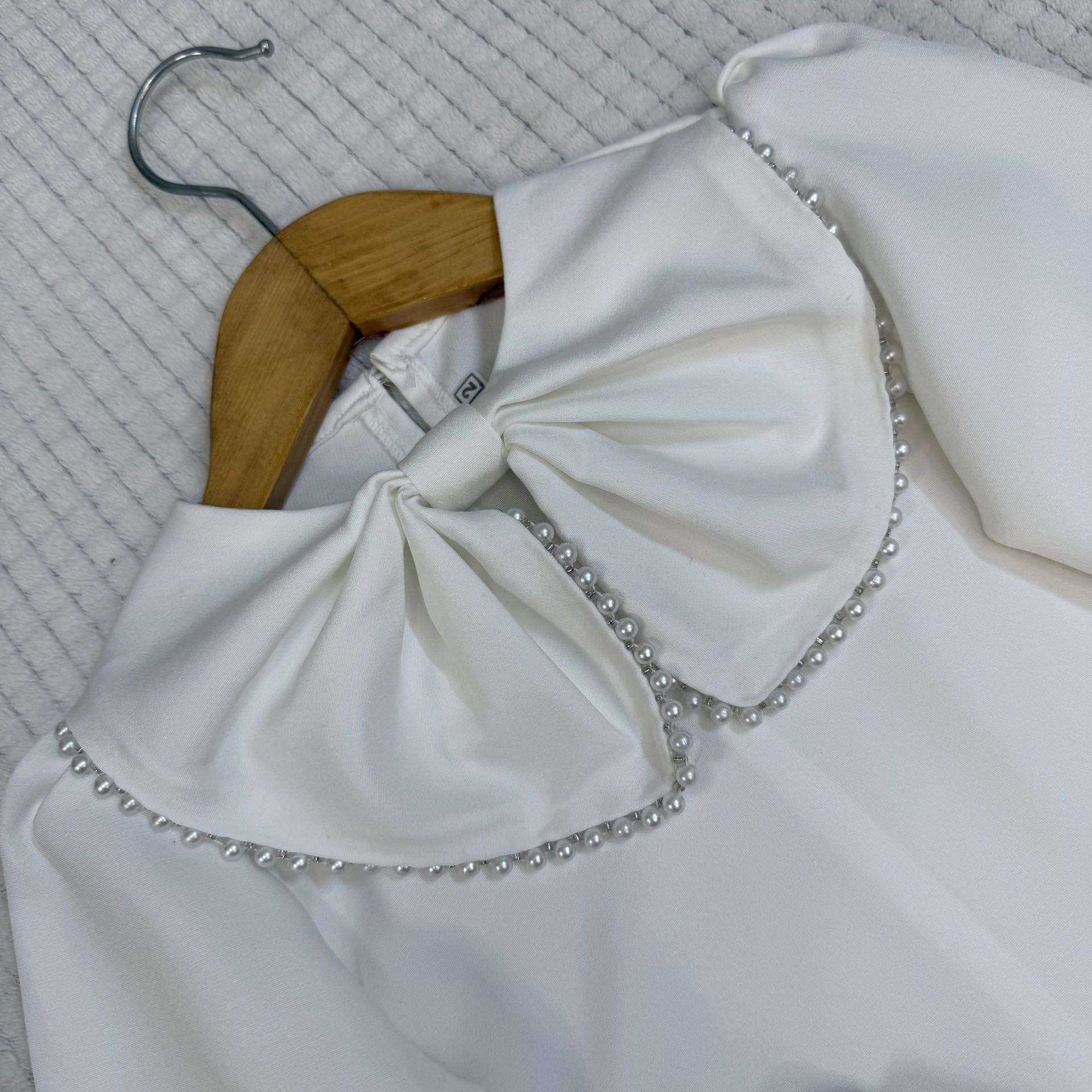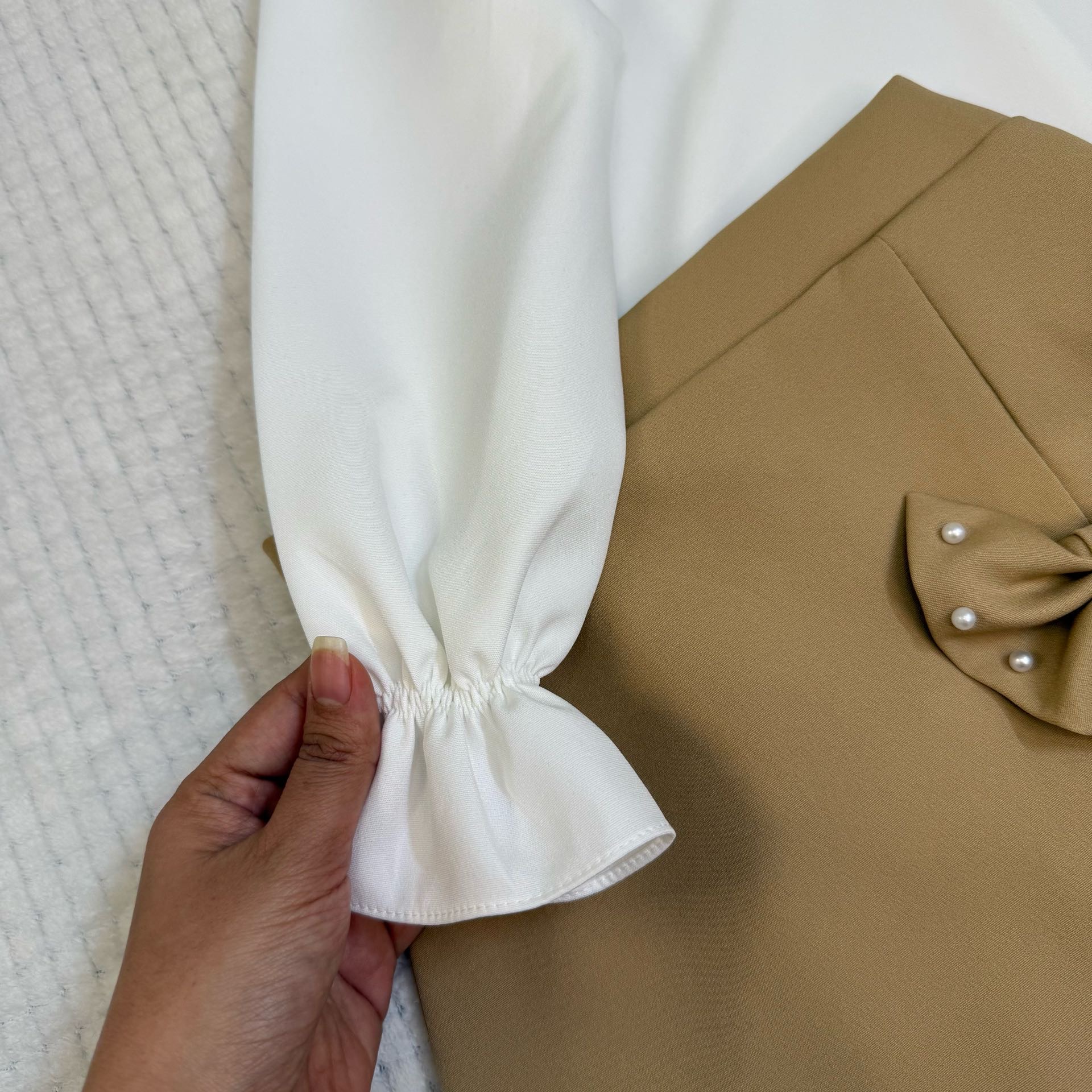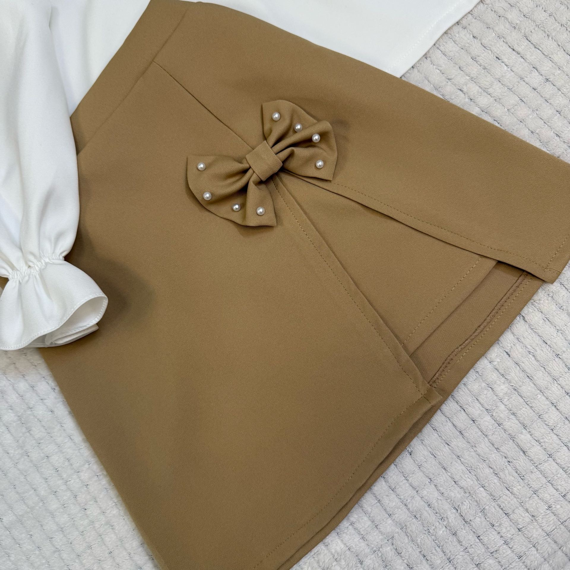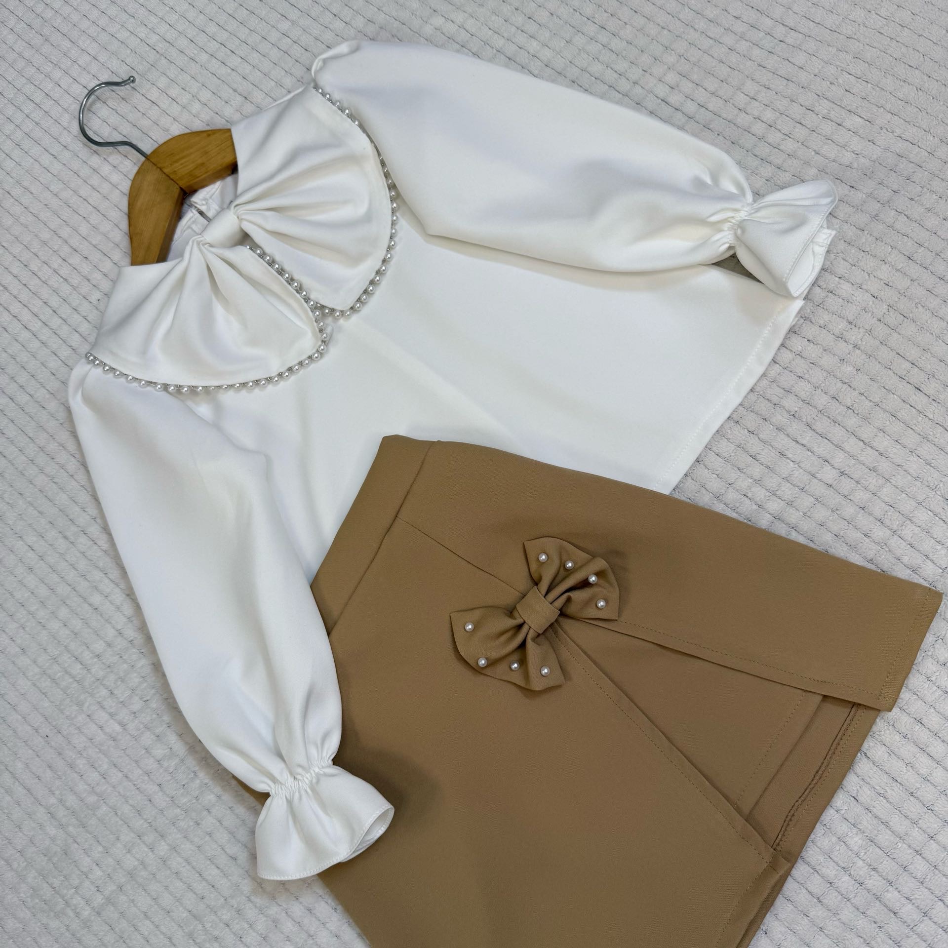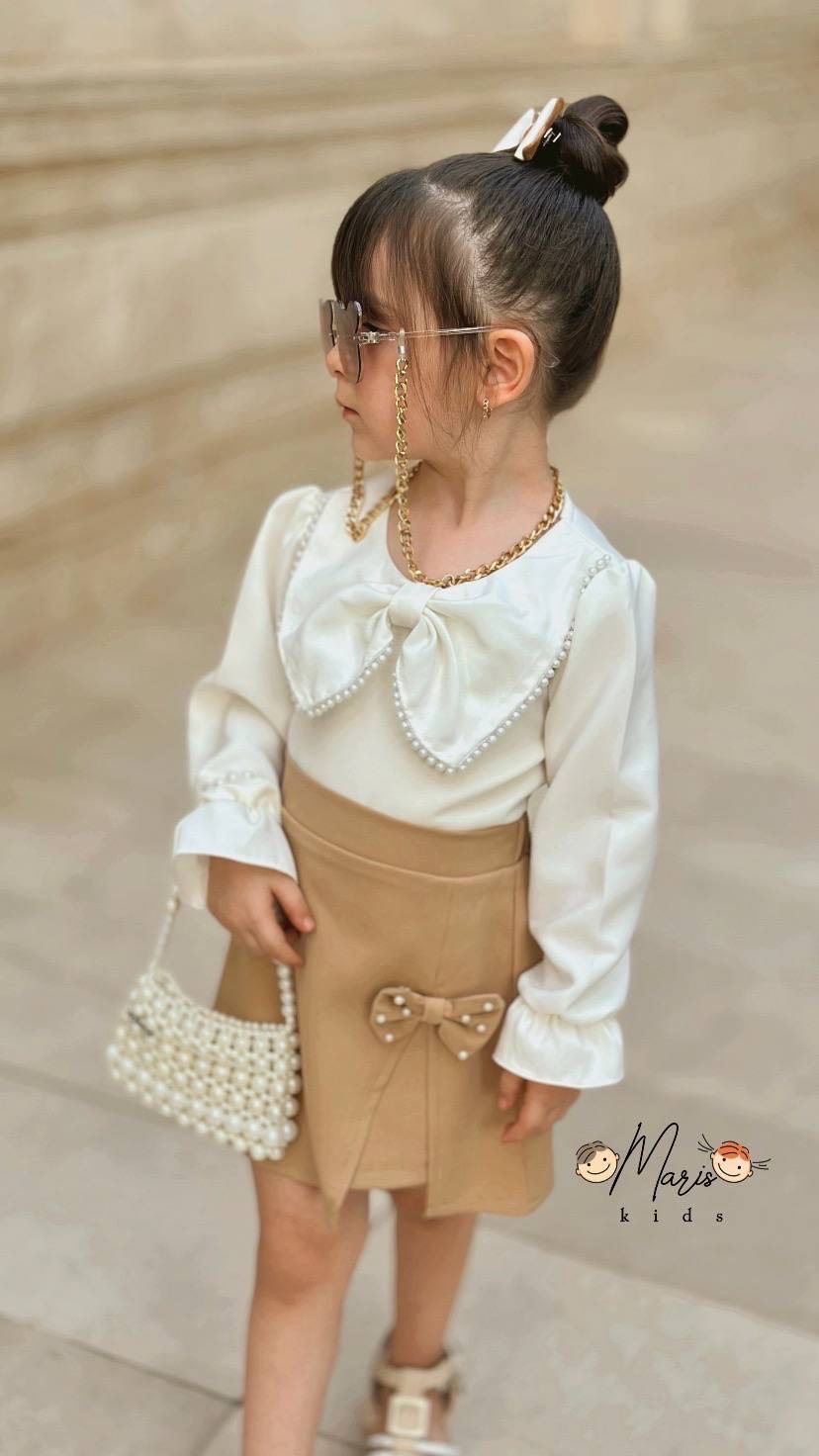 🐚ست مروارید • ست شامل شومیز و دامن مجلسی . یقه ی لباس مغزی مروارید کار شده پاپیون دامن مروارید پانچ شده • جنس محصول : مازراتی 🤍رنگ بلوز سفید 🤎رنگ دامن موکا
