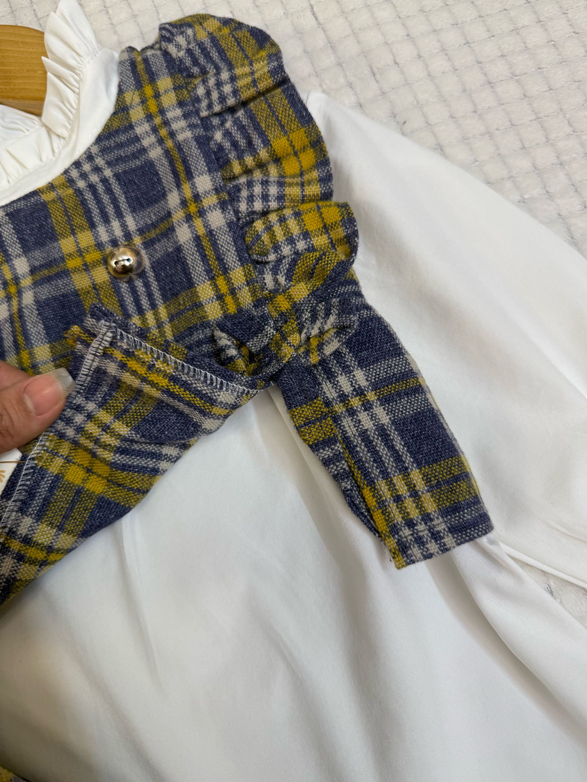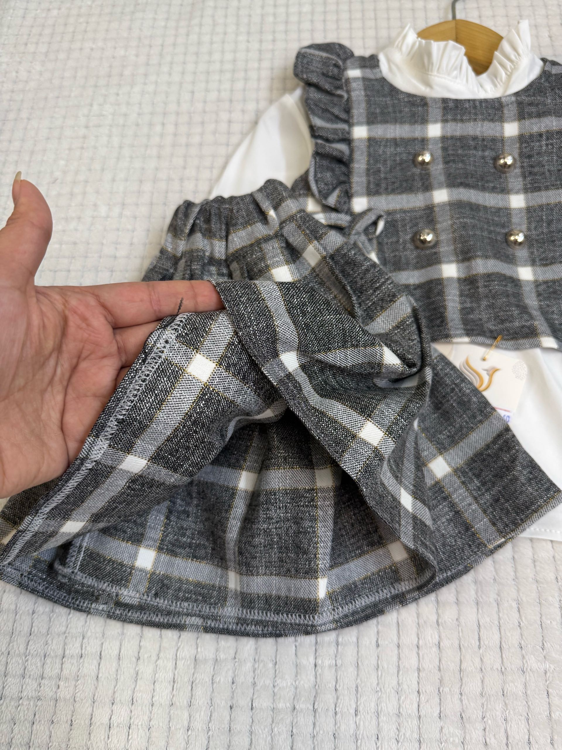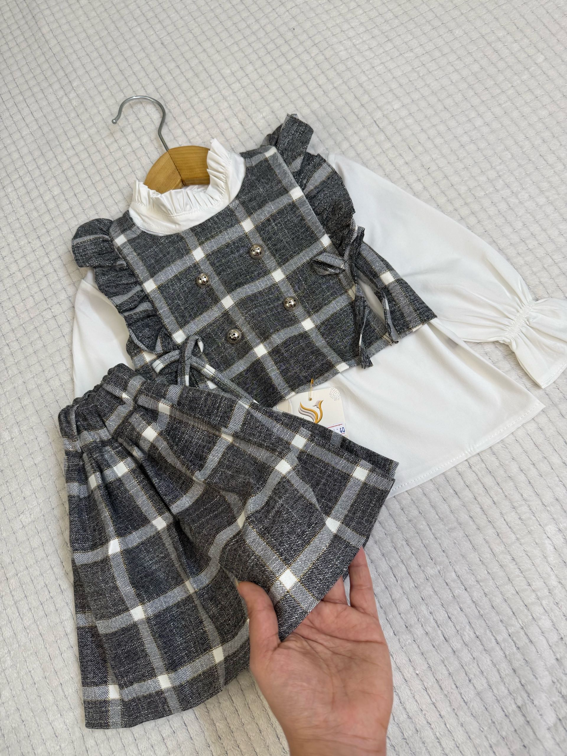 یکی از لباسهای فرزندتون رو روی سطح صاف پهن کنید و اندازه ها را باهم مقایسه کنید . برای راهنمایی بیشتر جهت انتخاب سایز اینجا کلیک کن 👈🏻راهنمای انتخاب سایز ست مجلسی بچگانه